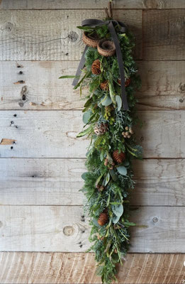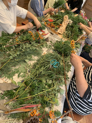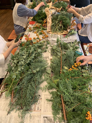 フレッシュなユーカリや赤が美しい葉などをリースワイヤーで束ねガーランドを作りました