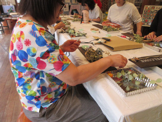 木製ボードにドライフラワーのアレンジを施しステンシルでお好きな文字を入れます。初めての参加者も素敵なボードができましたよ(^_^)