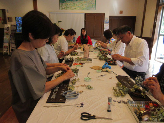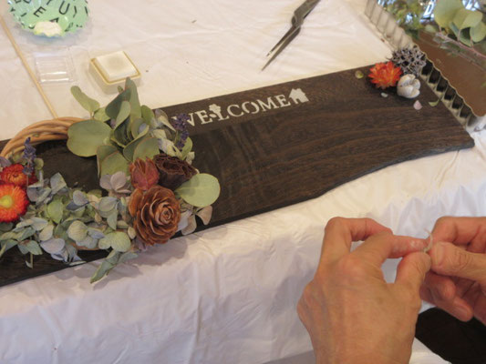 木製ボードにドライフラワーのアレンジを施しステンシルでお好きな文字を入れます。初めての参加者も素敵なボードができましたよ(^_^)
