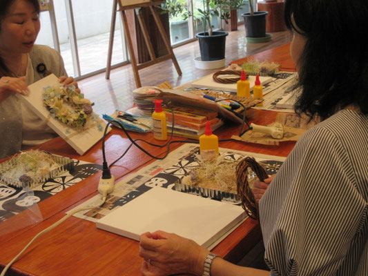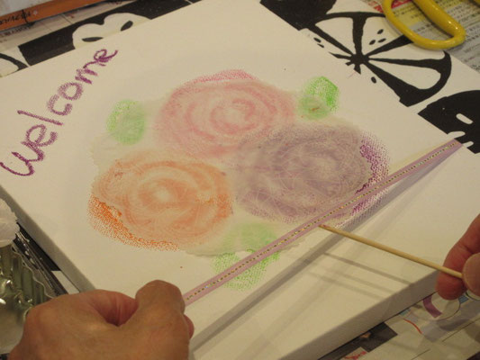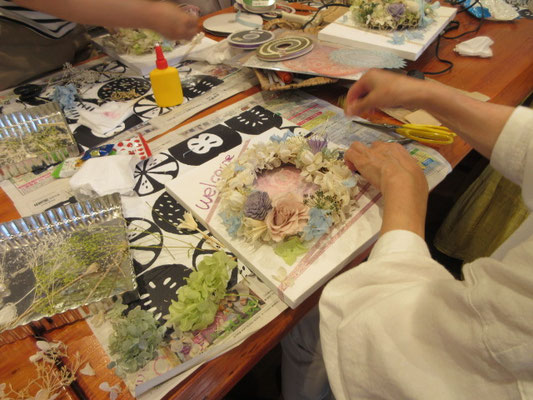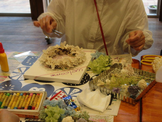 真っ白なキャンバスに、クレヨンで絵や文字を書いたりドライフラワーやプリザーブドフラワーなどでアレンジして素敵なリースができました(^_-)-☆